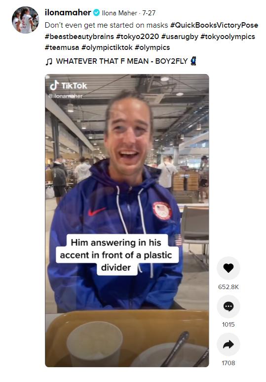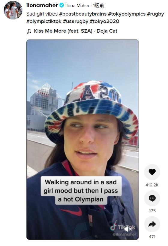 伊洛纳·马赫在奥运期间拍摄的短视频,当她心情低落时路过一个性感的选手,她迅速露出了微笑。除了日常生活以外,伊洛纳当然也没有忘记自己的运动员身份。她从今年2月开始,一直会定期发布关于英式橄榄球的相关内容和训练视频。最初,这是因为她发现美国很少人了解这项运动。“我在TikTok上看到美国球迷们说:‘我们居然有一支英式橄榄球队?英式橄榄球是啥?’然后,这场‘对话’就开始了。我希望英式橄榄球在这个国家发展起来。”伊洛纳说。