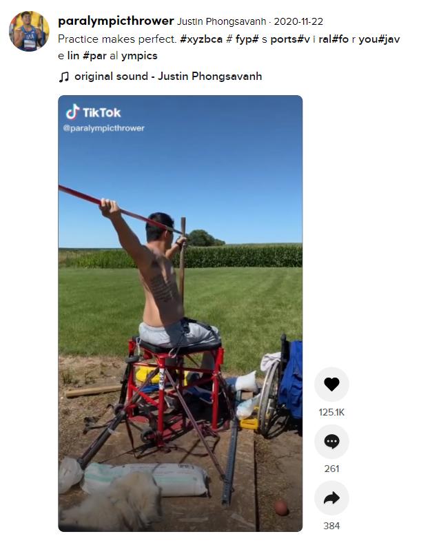 TikTok上非常受欢迎的残奥会标枪运动员贾斯汀·冯萨万(Justin Phongsavanh)今年24岁,他经常分享他的训练视频。