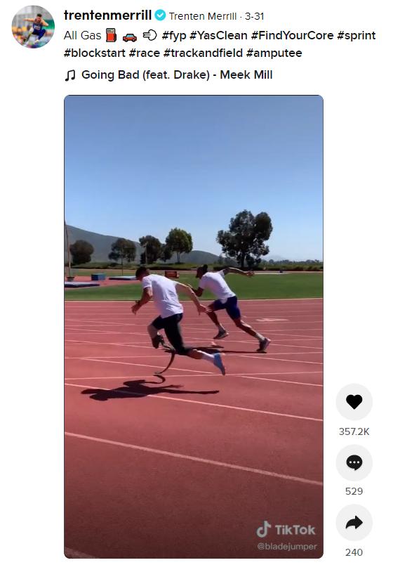 贾斯汀的室友、田径运动员特伦滕·梅里尔(Trenten Merrill)将参加东京残奥会跳远和200米项目,他也在TikTok上为残奥会带来了关注。