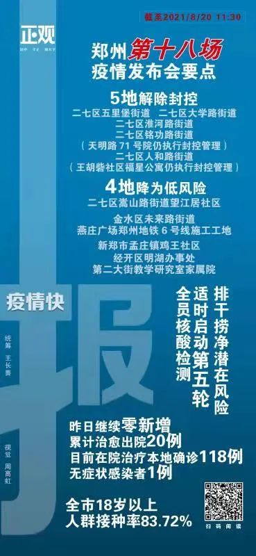 8月20日上午11时,郑州市新冠肺炎疫情防控领导小组办公室召开第十八场新闻发布会,通报疫情防控工作最新进展情况。无新增本地确诊病例和无症状感染者