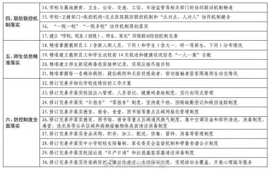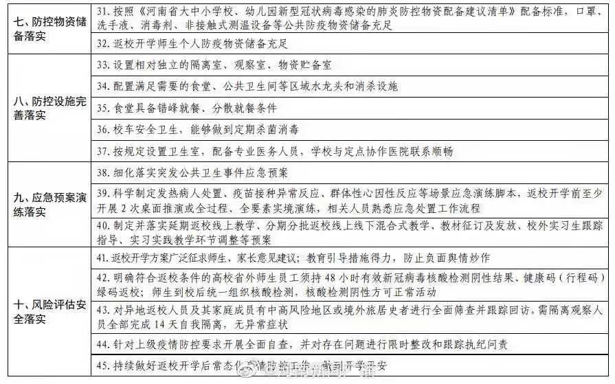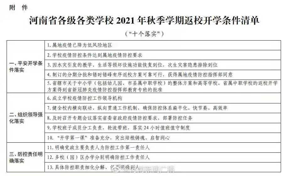 5)河南省新冠肺炎疫情防控指挥部教育系统工作专班办公室研究制定了《河南省各级各类学校2021年秋季学期返校开学条件清单》,稳妥推动全省各级各类学校返校开学。