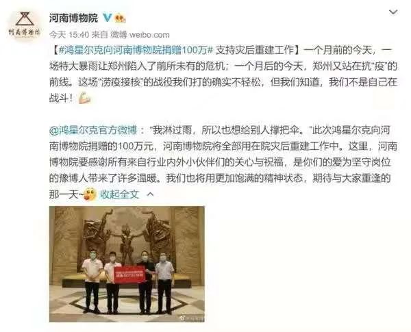 7)8月20日下午,鸿星尔克向河南博物院捐赠100万元,主要用于因“7·20”暴雨涉水受损设施的修缮。网友纷纷留言支持,并呼吁河南博物院与其联合开发文创产品。对此,河南博物院回复广大网友:“联名款,已经在路上啦!”
