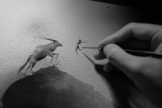 一黑一白,一动一静。即兴速写的酣畅感在其中,下笔肯定,动物的生命力带着喷发的温度。他说:“用水墨画画就和这个世界一样,下笔之后皆有意外。想办法把意外变得完整美妙,就是作画最有趣的地方。”