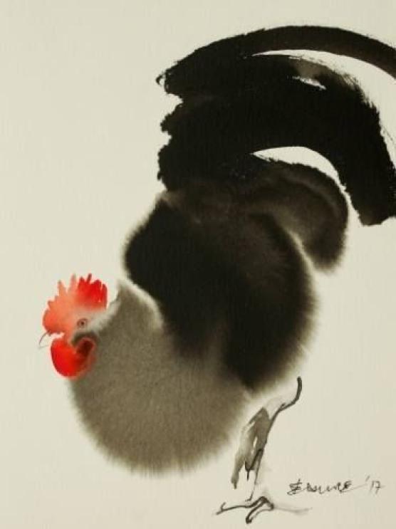 除了灵动的猫,公鸡也是他的代表作品。大片墨色的下沉恰恰是他独创的“留白”,无需场景,公鸡体态已然生动有趣。
