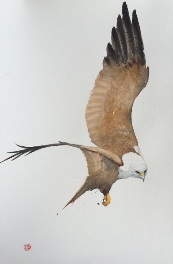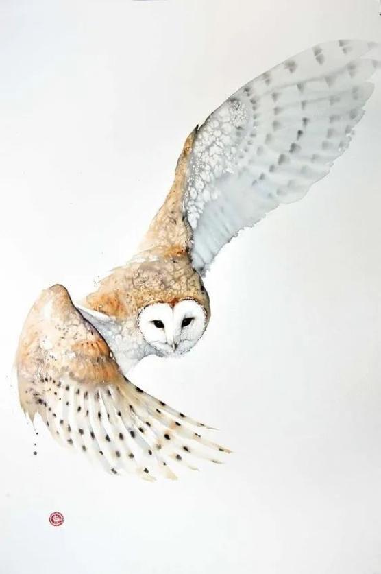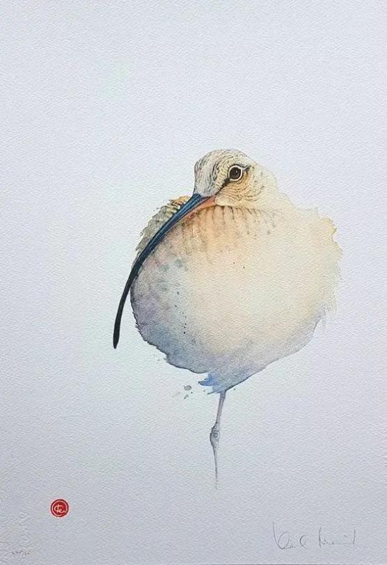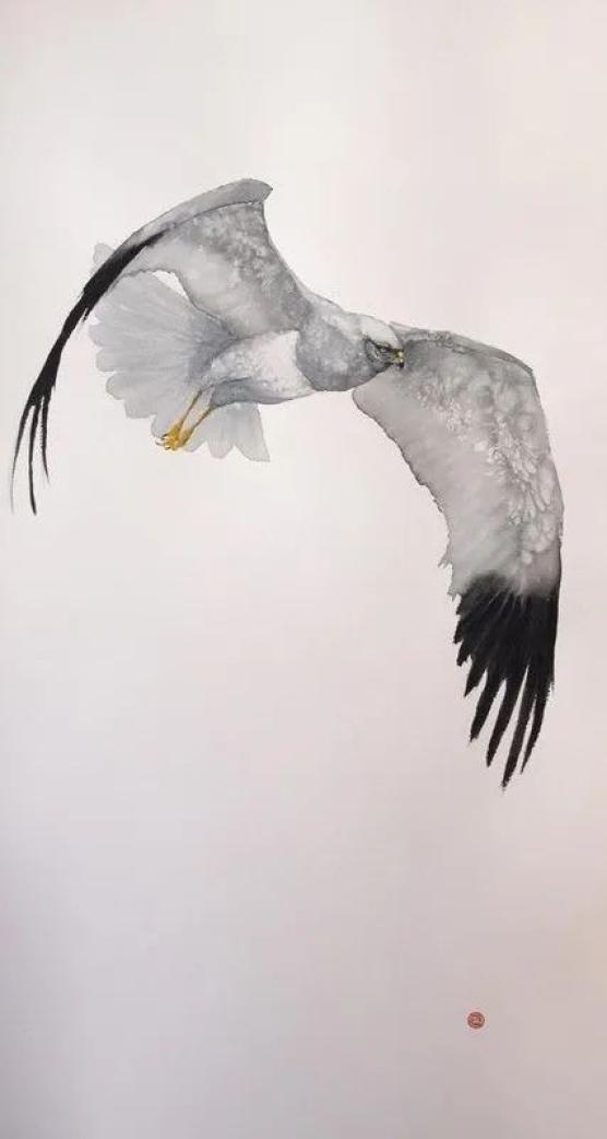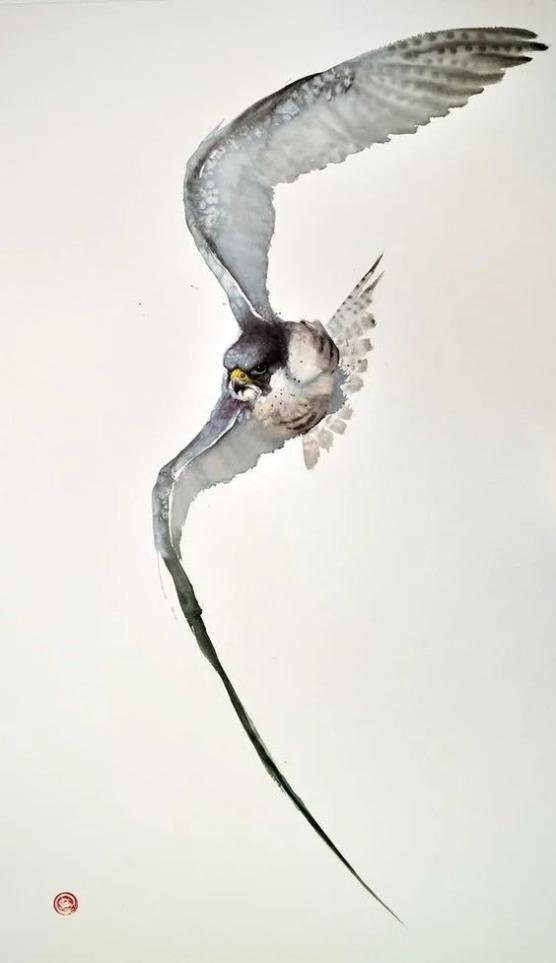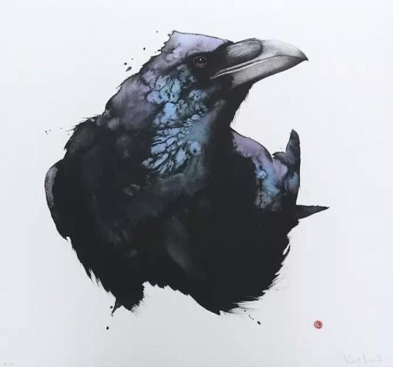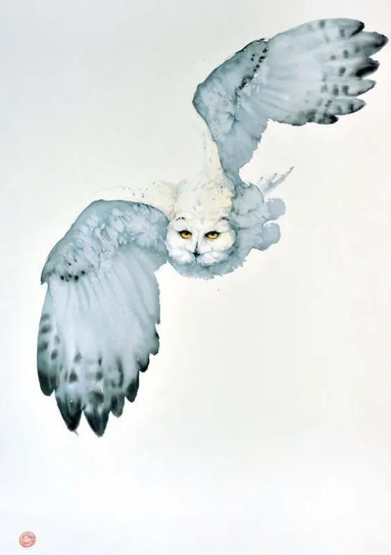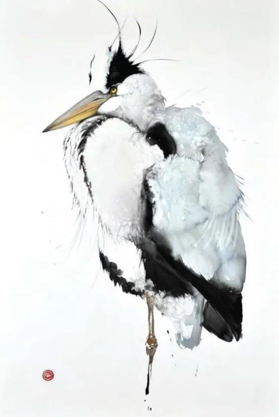 他利用中国的画笔,水墨,木炭以及手工纸,结合水彩所描绘的一组鸟类。绘画激发出了他对材料和技法不可预知性的探索。画中鸟类羽毛的蓬松感,用深深浅浅的水墨晕染呈现,舒服也自然。