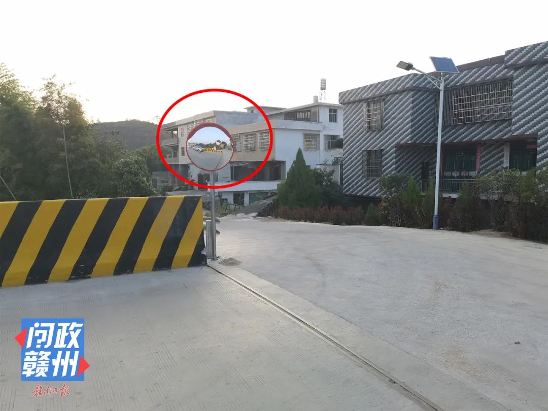 △改造后的纸帮大桥,桥头的拐弯路口安装了凸透镜。记者另悉,兴国县交通部门除了对纸帮大桥护墙实施改造外,还对社富大桥一侧同样存有遮挡视线的防撞护墙进行了切割,现也被改造成镂空不锈钢栏杆,并在桥头的拐弯路口安装了凸透镜。