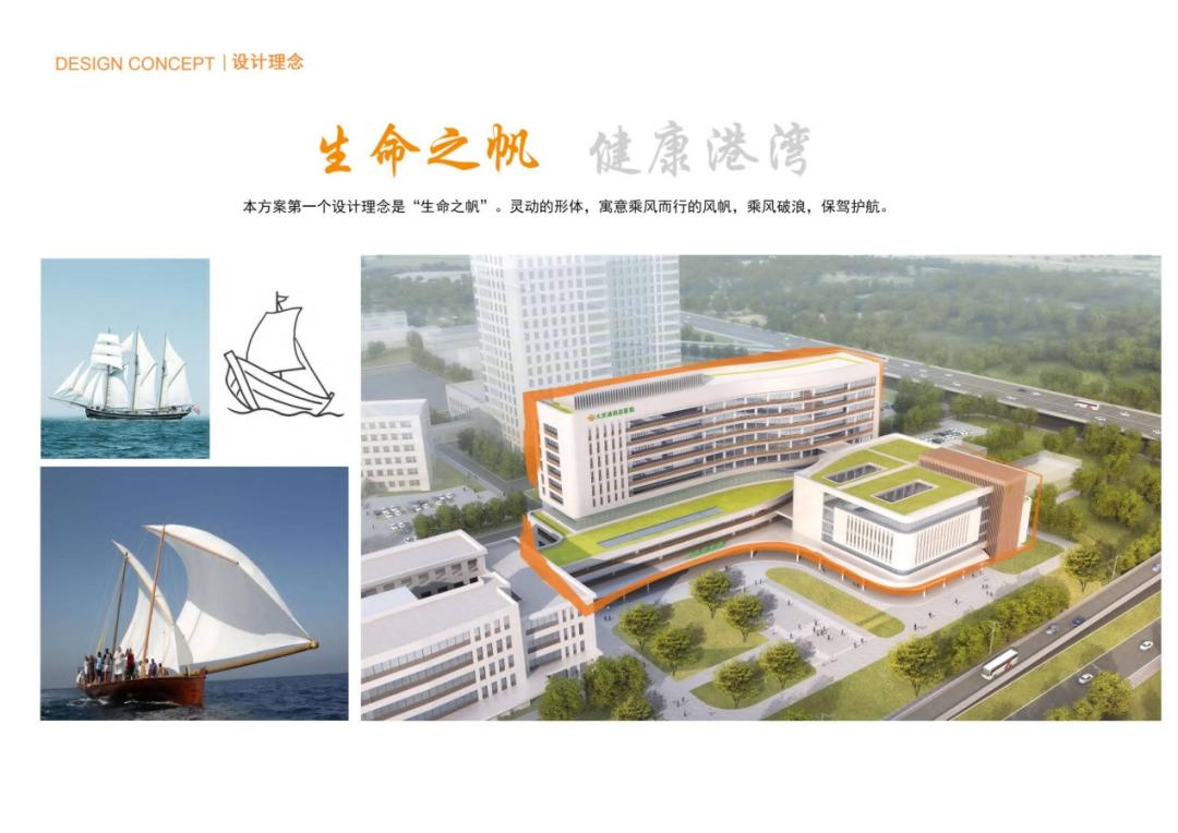 建筑整体外观设计理念是“生命之帆”,灵动的形体,寓意乘风而行的风帆,乘风破浪,保驾护航,将是一座具体区域地标性的医疗建筑。全新的就医环境值得期待