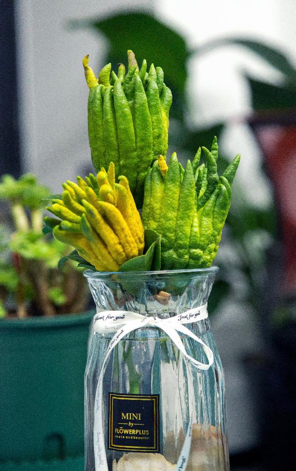 佛手,发音上与“福寿”谐音,又因果形金黄,也有一定的观赏价值。以前的佛手柑植株不仅枝干粗壮,枝茎上还带有尖刺,着实不太适宜放在室内作为观赏植物。然而近年来通过嫁接技术和植株突变培育,已培养出植株小、枝干不带刺、以观赏为目的的小型佛手柑树。对应长出的佛手柑个体也变小,但外形却没有变化。