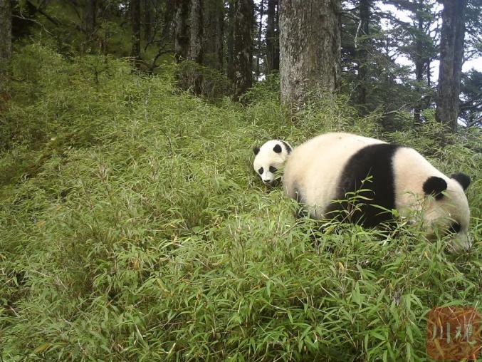 大熊猫国家公园卧龙片区红外相机图片:在无人打扰的环境中,野生大熊猫妈妈带着幼崽外出活动