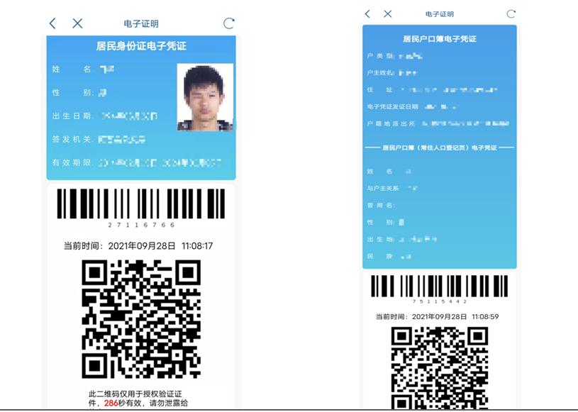 (7) 人脸识别完成后返回证照列表,选择认证完成的居民身份证;点击图中二维码,输入6位“亮证密码”即可实现“亮证”。