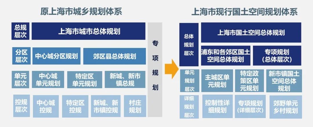 规划体系改革要求。目前,在中共中央、国务院重要战略部署下,上海市已建立了空间合一、时间衔接的规划编制审批体系。空间维度上,由总体规划、单元规划、详细规划三个层次构建了层次分明、衔接统一的规划体系。