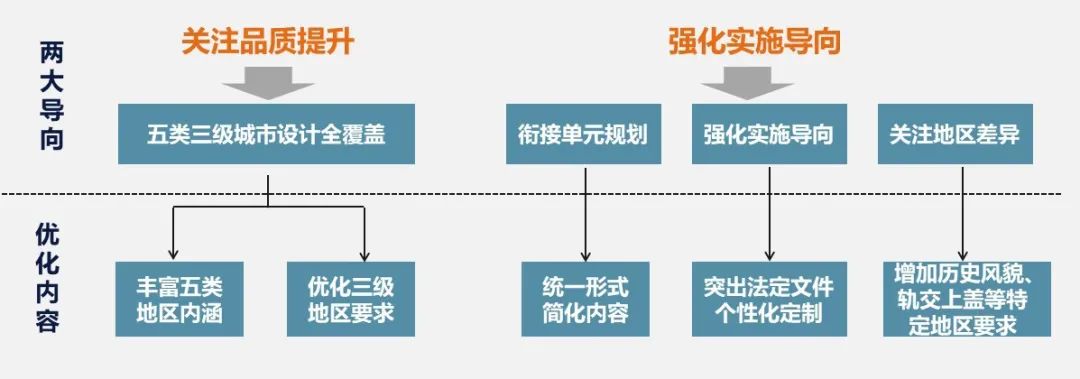 以城市设计为抓手,完善分级分类管控体系。在差异化管控方面,主要体现在坚持既有公共活动中心区、历史风貌地区等五种功能类型的基础上,进一步细化了分类管控的要求。在完善城市设计工具箱方面,主要体现在增补完善城市设计要素与提高管控要素的包容性两方面。一是,在确保整体性、系统性、公共性要素落位的基础上,结合城市设计方案意图,重点优化强制性要素的弹性管控形式。二是,对于有特殊控制要求的地区,在明确增补控制要素的释义的情况下,可根据规划需要增加个性化的控制要素。