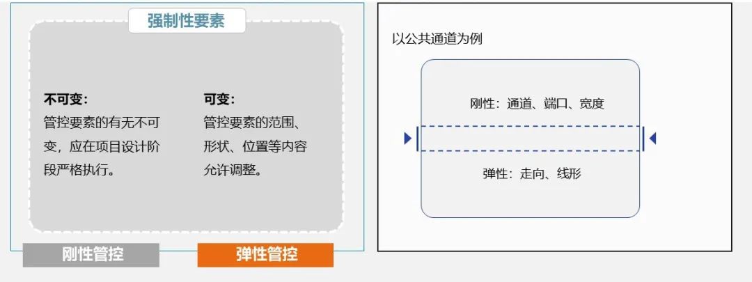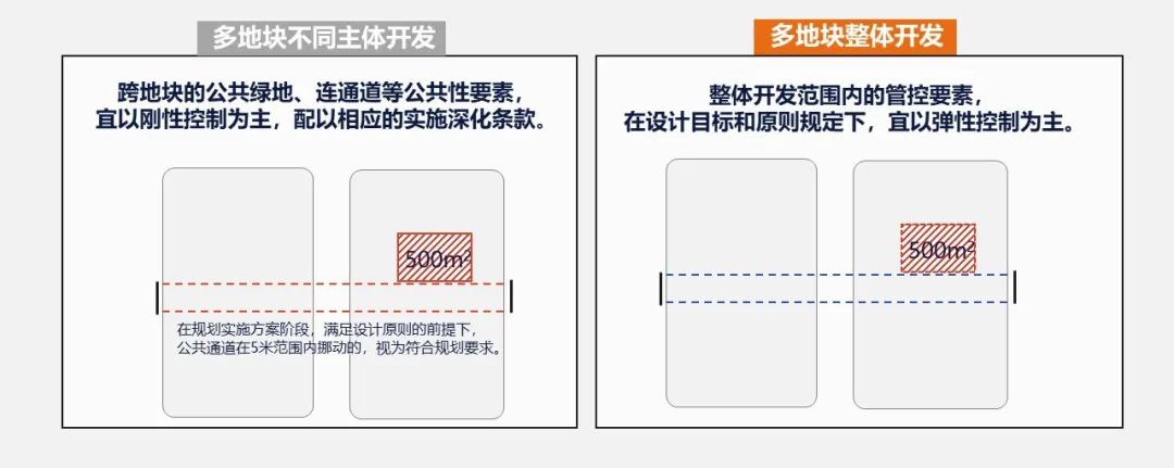 面向实施,合理选择要素管控方式。多地块不同主体开发时,跨地块的公共绿地、连通道等公共性要素,宜以刚性控制为主,配以相应的实施深化条款。针对多个地块整体开发时,整体开发范围内的城市设计要素在符合设计原则的基础上,宜以弹性控制为主,充分发挥开发主体的能动性和创造性。