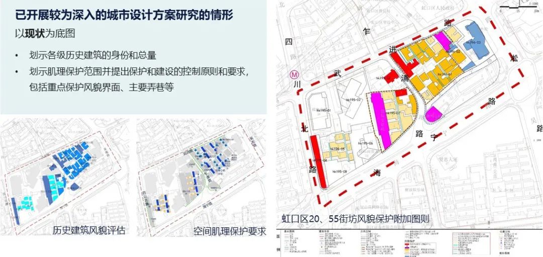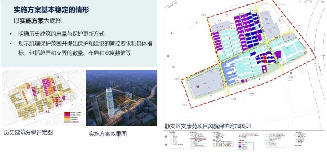 风貌保护地区的差异引导实践。风貌保护地区的控规编制,结合城市设计研究深度的不同,形成风貌甄别和实施方案两类图则表达深度。风貌甄别深度的风貌保护控制图则,工作重点以落实历史保护要求为主,适用于已开展较为深入的城市设计方案研究的情形。控规编制以现状为底图,主要任务是对保护范围内的要素提出建设的控制原则和要求,对保护范围外的开发地块明确城市设计控制要素。实施方案深度的风貌保护控制图则,适用于实施方案基本稳定的情形,控规编制中以实施方案为底图,在划示优秀历史建筑和文保单位、文物保护点的基础上,明确历史建筑的保护是更新方式,并提出肌理保护范围内保护和建设应满足的管控要求和具体指标。