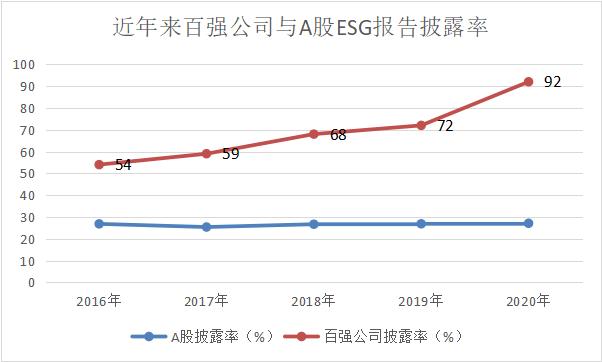 百强公司ESG报告披露率(披露公司数量/公司总数)由2016年的54%增长至2020年的92%,明显高于A股整体水平。