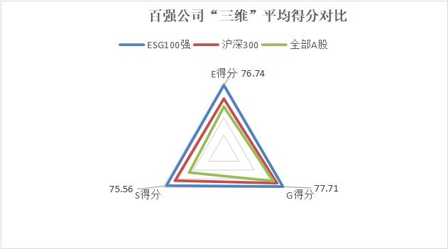从得分来看,百强公司不仅总得分领先,在环境、社会、公司治理“三维”得分上均具备优势。数据显示,以百分制衡量,百强公司的ESG绩效得分在76至99之间,平均得分高于沪深300成分股与全部A股的得分均值,在环境、社会与公司治理三大维度平均得分均领先于沪深300与A股整体(注:全部A股指截至2021年4月底上市的公司,下同)。