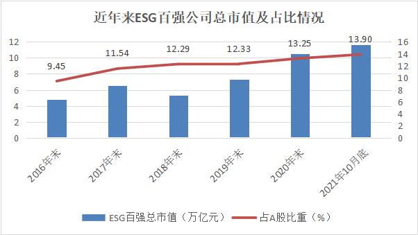 近年来,百强公司总市值及占比逐年上升,话语权大幅增加。截至今年10月底,A股ESG百强企业总市值合计达11.6万亿元,占全部A股总市值近14%。