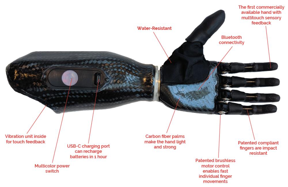 Psyonic 的人造手重 500 克,大约和成人真手的平均重量一致。Akhtar 介绍说,大多数假手要比它再重 20% 左右。Ability Hand 包含六个安装在碳纤维外壳中的电机。它有硅胶手指、电池组和放置在患者残肢上的肌肉传感器。如果患者肘部以下截肢,两个肌肉传感器也可以放置在他 / 她完整的前臂肌肉上。人们能够使用这些传感器来控制手的运动和抓握。