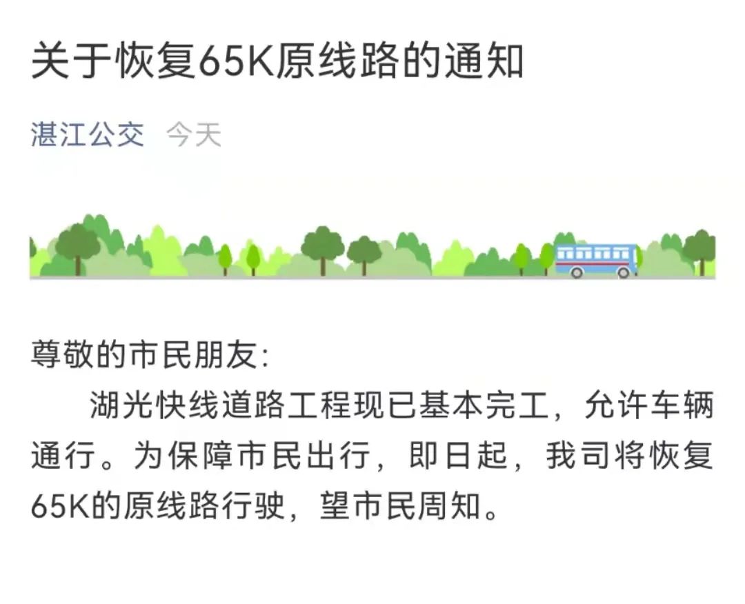 为保障市民出行,湛江公交恢复65K的原线路行驶。