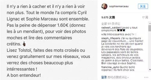(苏菲·玛索Ins原文:没有什么好遮掩的,也没有什么好围观的。所有人都清楚Sophie Mariceau和Cyril Lignac在一起了。