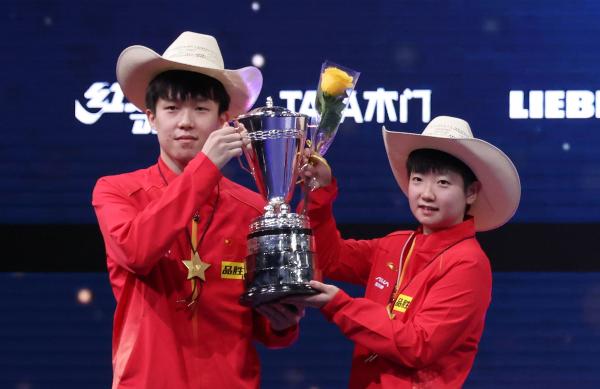 王楚钦/孙颖莎捧起冠军奖杯。 CFP 图