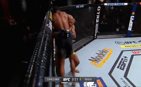 就在大家认为,凯文-霍兰德一时间无法脱困时,戏剧性一幕出现了,地面缠斗中,凯文-霍兰德突然打出一击刁钻的下位重拳,直接给罗纳尔多-索萨造成重创,面对摇摇欲坠的对手,随即霍兰德急忙起身上前补拳,直接将索萨KO。