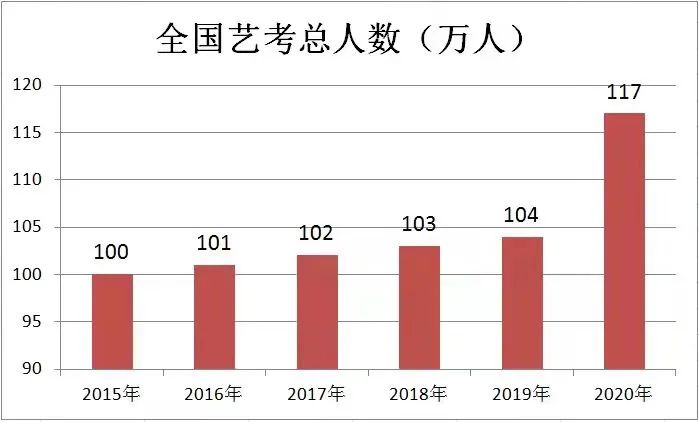 2015年至2020年,全国艺考总人数逐年递增,2020年已突破110万人(图源:艺考界)