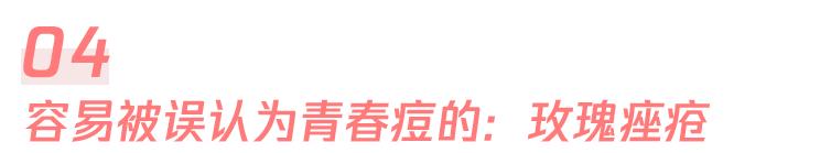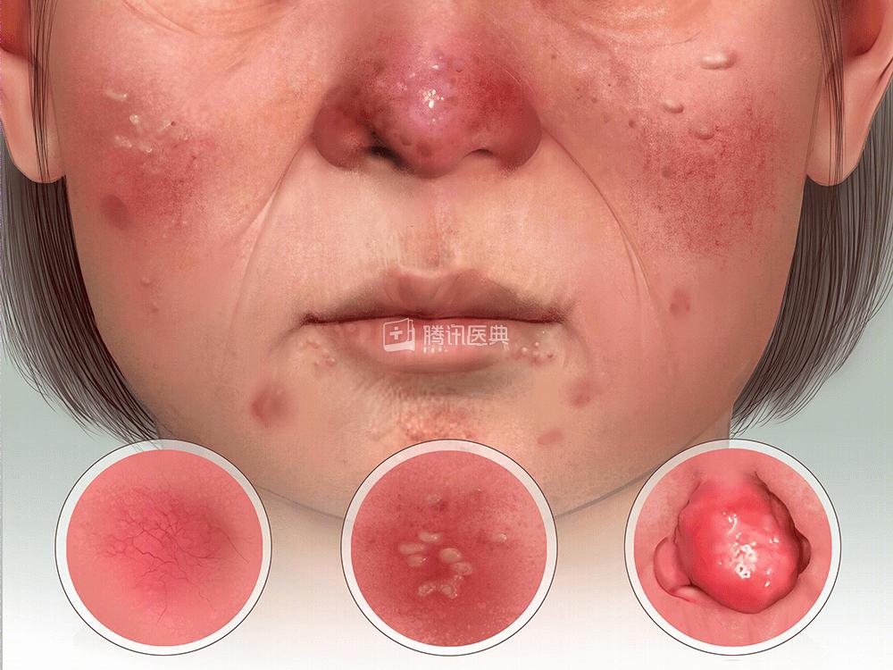 根据症状不同,分为红斑型、丘疹脓疱型、鼻赘型、眼型四种亚型。不同亚型表现差别较大,其中的丘疹脓疱型,外观高度类似痤疮(痘痘),常被误诊。