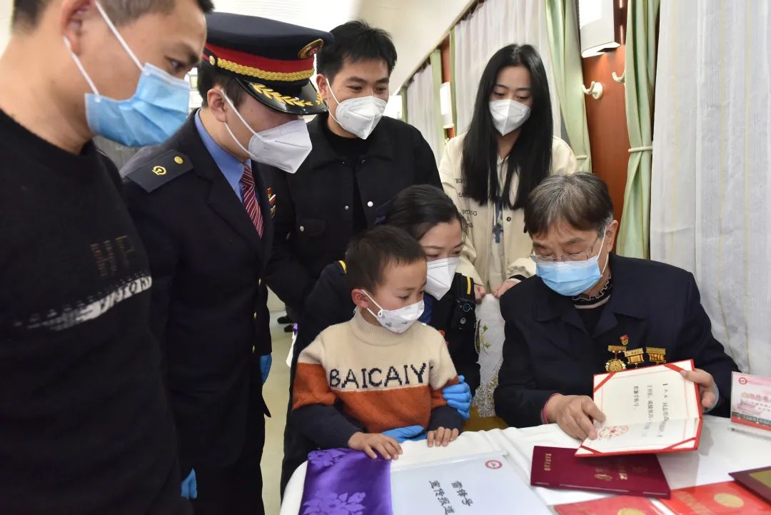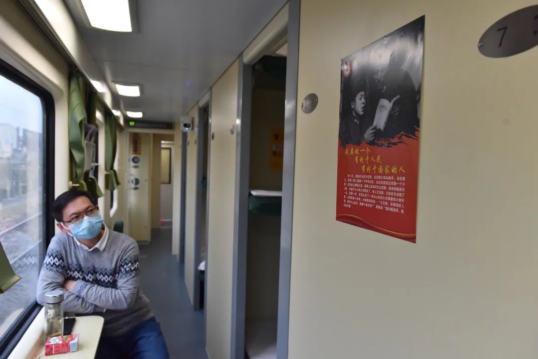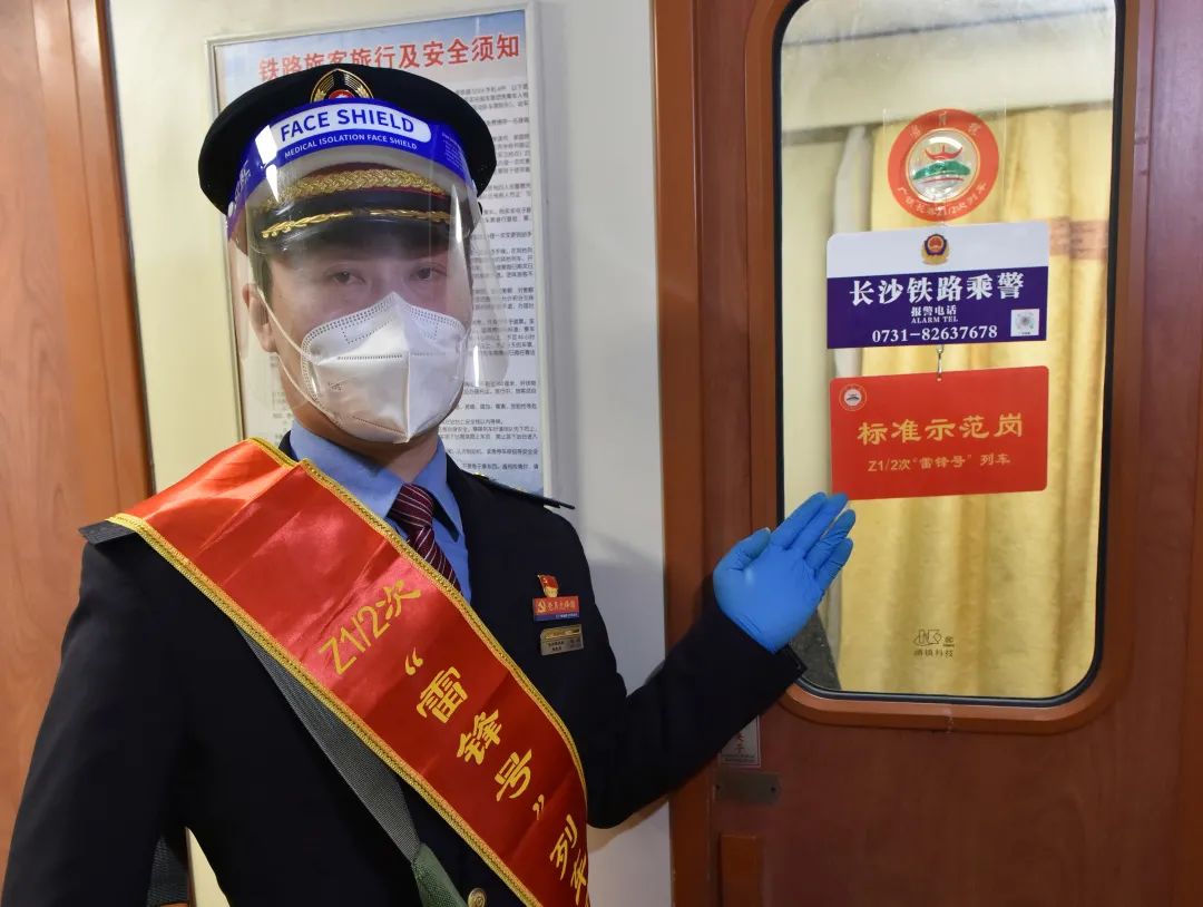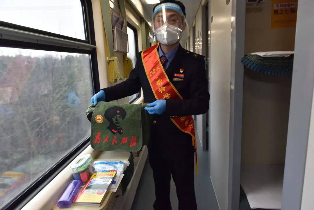 今年2月13日,Z2次列车长沙站始发,列车长易文权带领学雷锋小分队成员搀扶着101岁高龄的谭爷爷走进车厢。发现谭爷爷的口罩污损了,易文权打开随身携带的“雷锋包”,取出备用口罩换上,详细询问其旅行需求后,将套餐、矿泉水送至铺位旁。