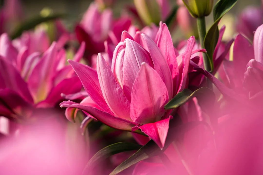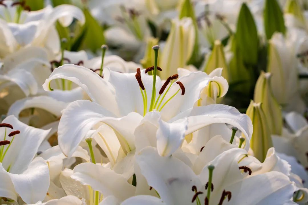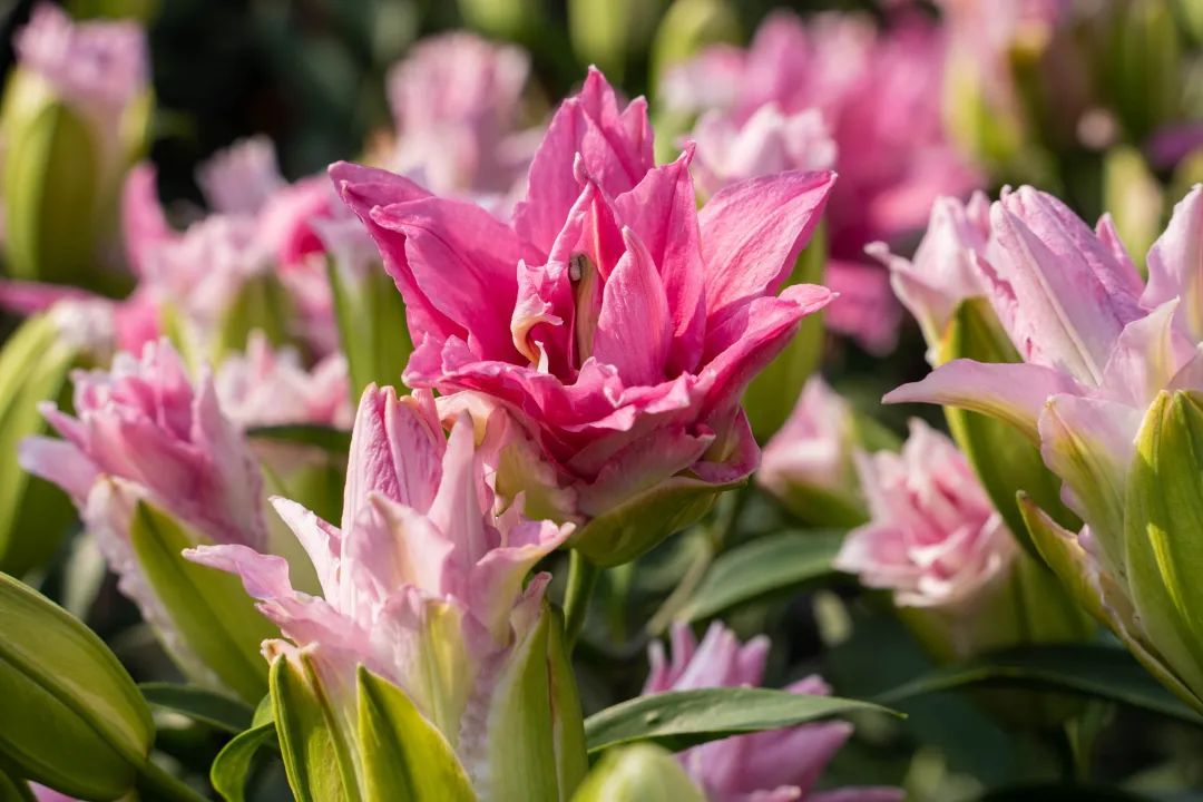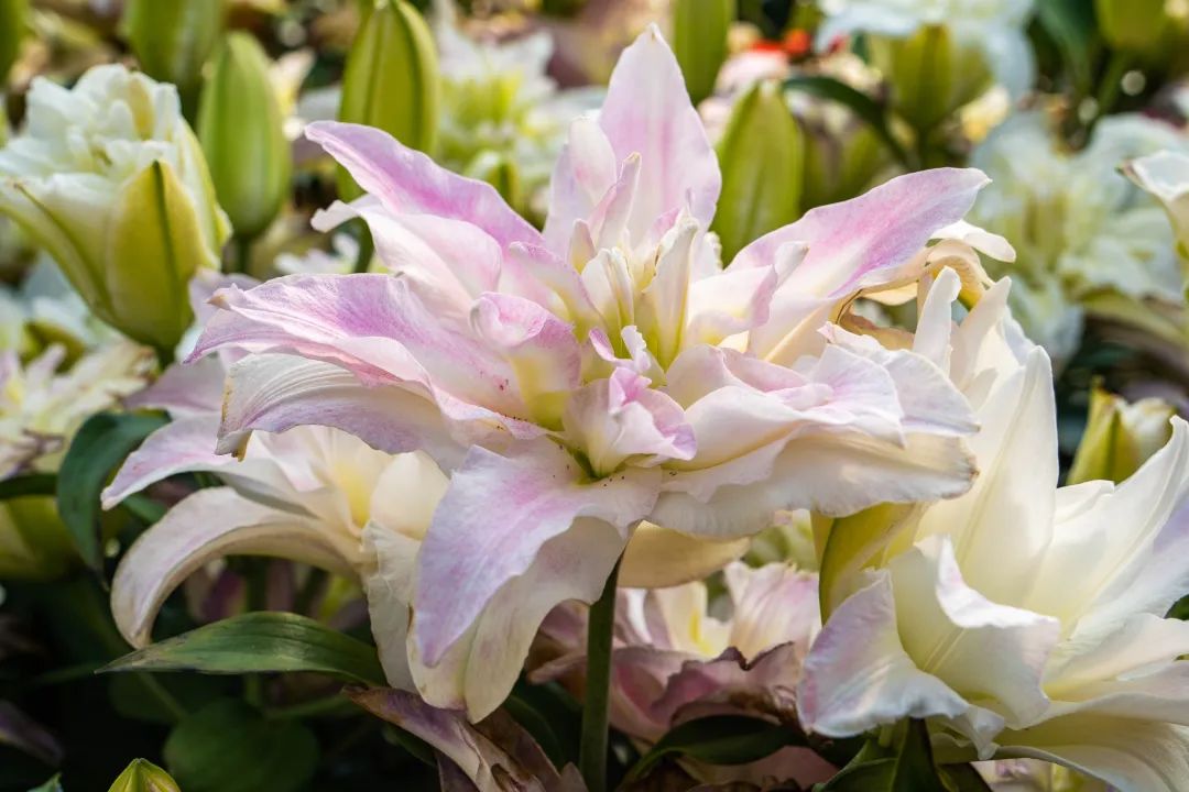 其中重瓣类型的百合花更是市场上的新贵。重瓣百合与普通百合在植株上没什么变化,花朵则相比起普通的单瓣更百合为立体,20多片花瓣影影绰绰的叠复在一起,以百合之姿开出了不输牡丹、芍药的馥郁繁盛。其次,重瓣百合观赏期长,差不多能有一个月且没有花粉,消费者不用担心花粉过敏和花粉四处飘洒难以清洁。同时,重瓣百合花色丰富,有白色、红色、粉色及多种复色品种,可以地栽于庭院、花坛造景,用于立体装饰等。