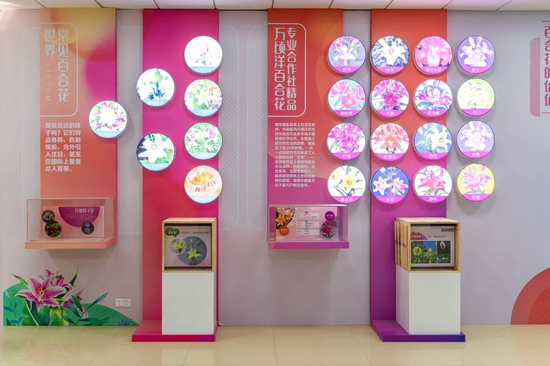 百合花文化科普展馆展示了百合花的功效、种植过程、新品种展示等内容。