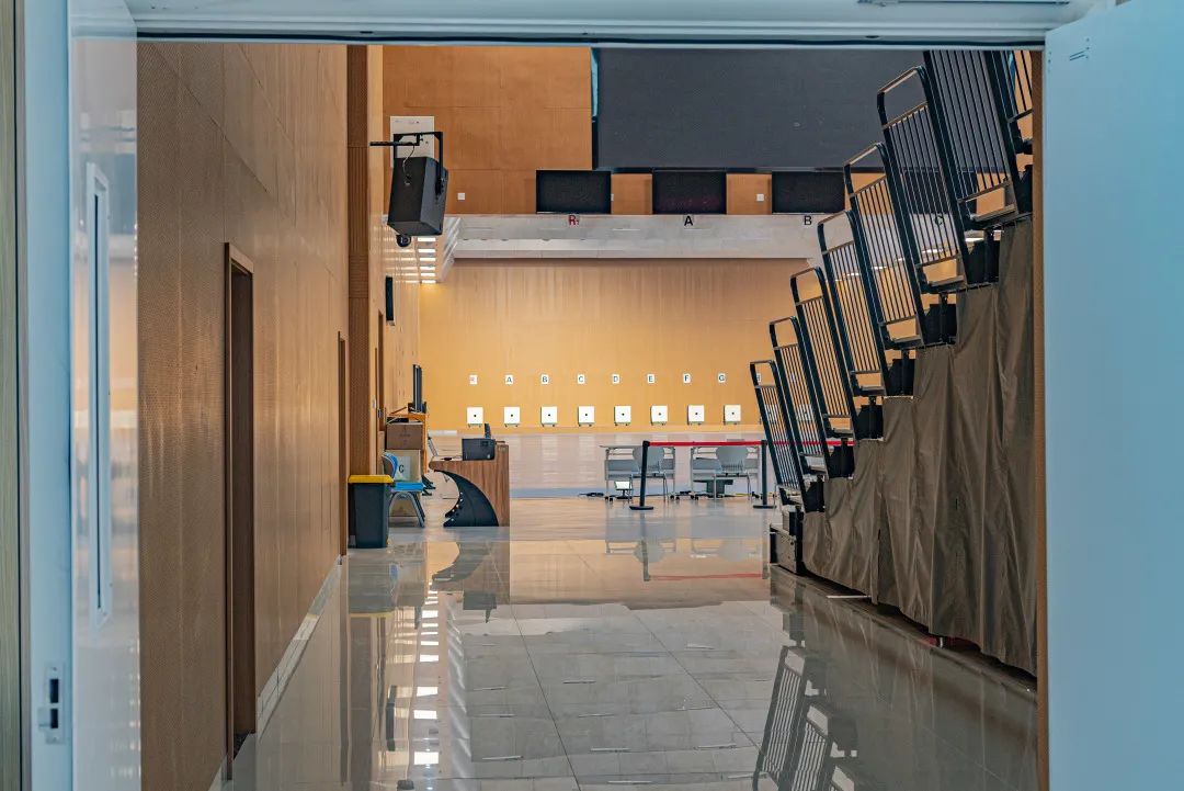 场馆内部走进射击场馆内,记者看到,大厅内宽敞干净、整洁明亮,共设置2个进出口。除了比赛场地,还有更衣室、医务室、新闻发布厅等功能性配套用房分布其间。整个场馆分为地上三层,地下一层,共有4个比赛场地,一楼为10米、25米预赛馆,二楼为50米预赛馆,三楼为决赛馆,地下一层还专门建设了选手储存器械的枪弹库。