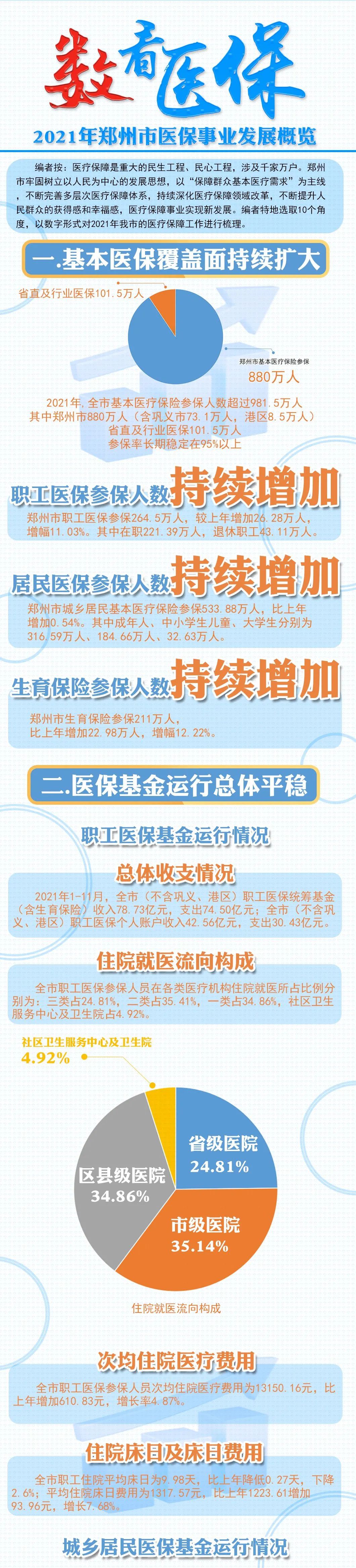 ■郑州晒出医疗保障“成绩单”,2021年基本医保制度覆盖981.5万“郑州人”,其中郑州市879.98万人参保率长期稳定在95%以上。