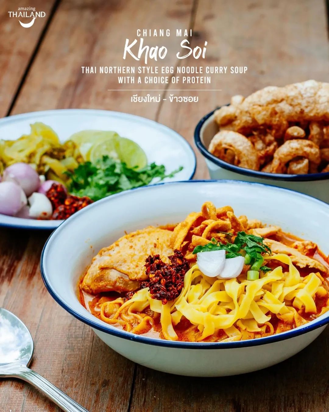 “泰”美味泰北金面又称清迈面,是一种美味浓郁、奶油味浓、微辣的黄色咖喱菜,发源于泰国北部。汤底是微辣的肉汤,由椰奶和红咖喱酱混合而成。肉汤里放入鸡蛋面和多种肉类,通常包括鸡肉、牛肉和猪肉。再在上面放一把脆炸面和切碎的香菜。