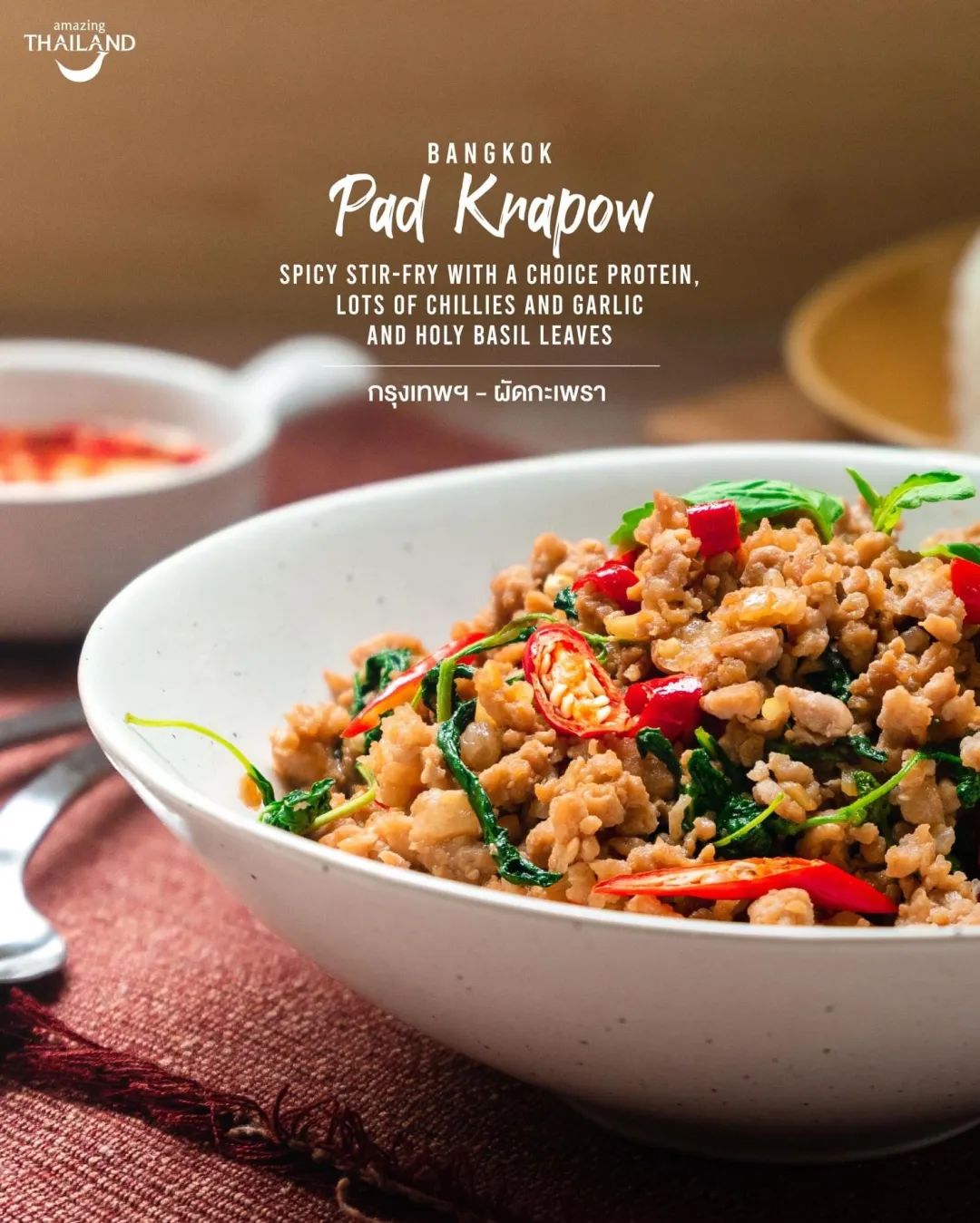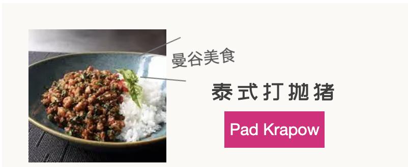 “泰”美味这道菜的英文名叫Pad Krapow Moo,所以也有人根据发音直接叫它“泰式打抛猪”。打抛猪是一道泰国很有名的料理,在泰国当地或是泰式料理的餐馆都可以吃得到。简单解释一下意思,pad 是炒, krapow(“打抛”)是泰国当地的一种香草圣罗勒(thai holy basil),moo是猪肉,配以其它调味料制成打抛酱后与猪肉同炒,就做成美味下凡的打抛猪了!