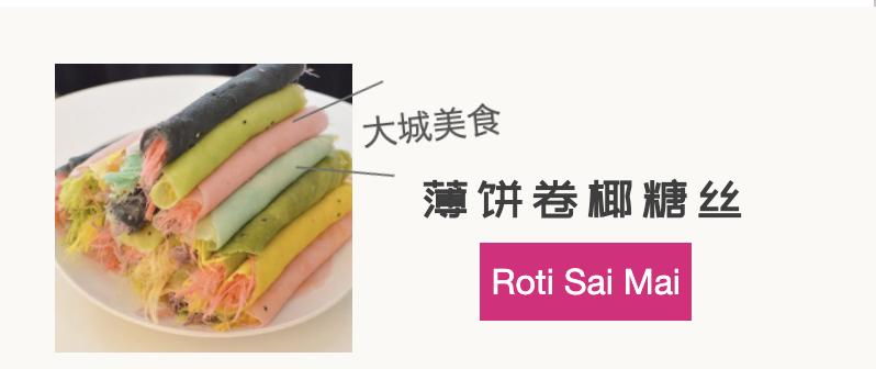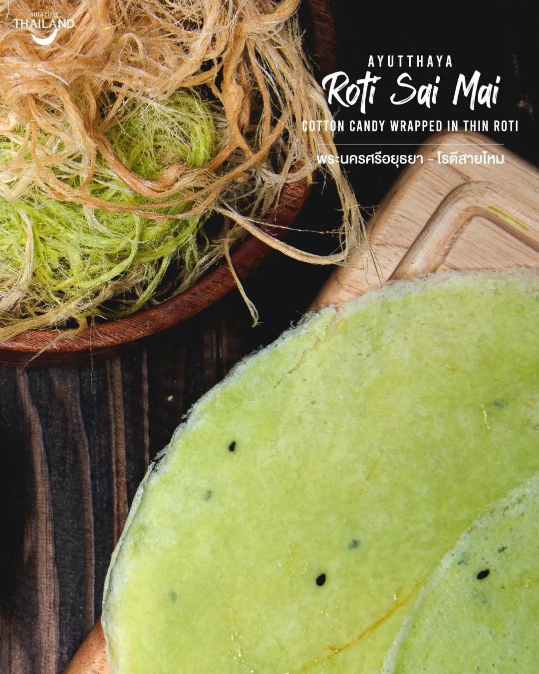 “泰”美味Roti Sai Mai 是泰国大城府的特色小食,以薄饼皮卷着糖丝,咸咸甜甜的。像泰国其他甜品一样,糖丝及薄饼皮都是五颜六色的,有绿、红、紫色等等。