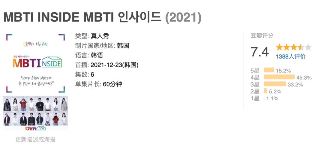 时至当下,MBTI的传播维度更趋丰富。在韩国,已经有影视、综艺紧跟这一「风口」,拍摄了观察类综艺《MBTI inside》和网剧《看见你的MBTI》。至于在社交媒体上,MBTI则成了继属相、星座外的又一种社交tag。