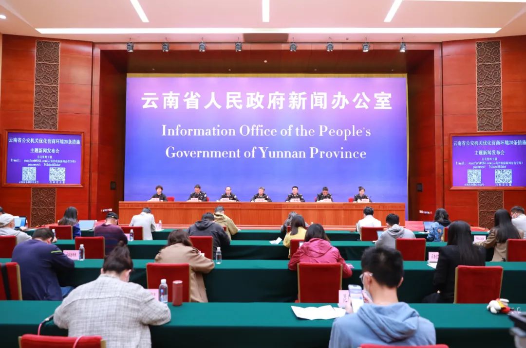 3月29日,云南省人民政府新闻办公室在昆明海埂会堂举行全省公安机关优化营商环境20条措施主题新闻发布会,通报全省公安机关优化营商环境工作措施成效,发布全省公安机关优化营商环境20条措施。省公安厅党委委员、政治部主任郭品,以及经侦、治安、交警、环食药侦、法制等警种部门负责人参加发布会并回答记者提问。省人民政府新闻办公室对外新闻处处长宗霞主持发布会,中央驻滇、香港驻滇和云南省内各新闻媒体记者参加发布会。会议通报