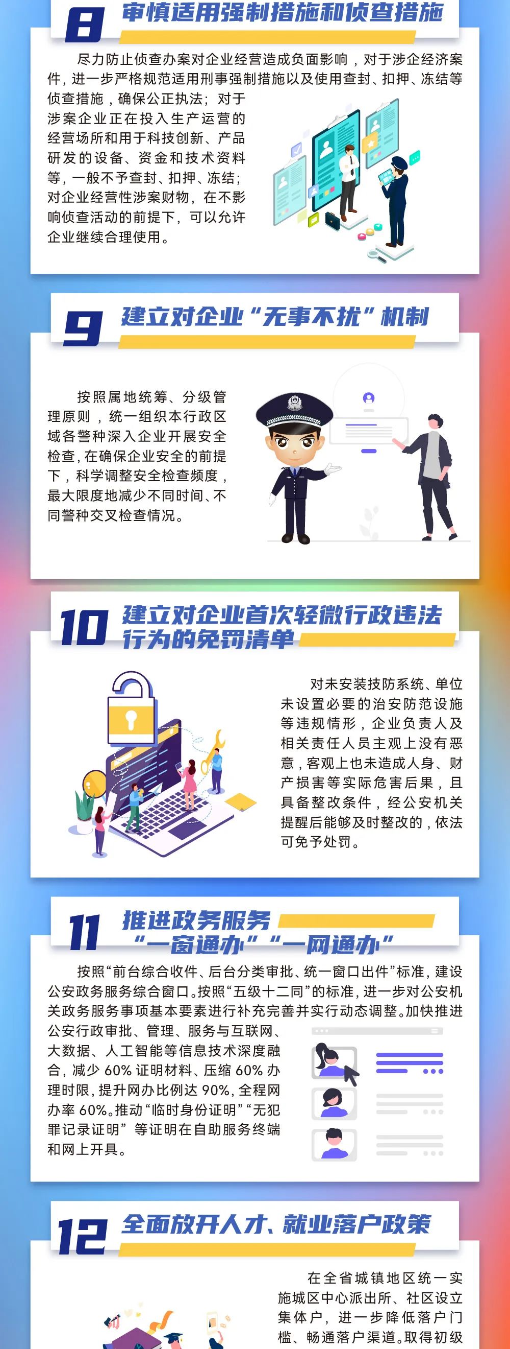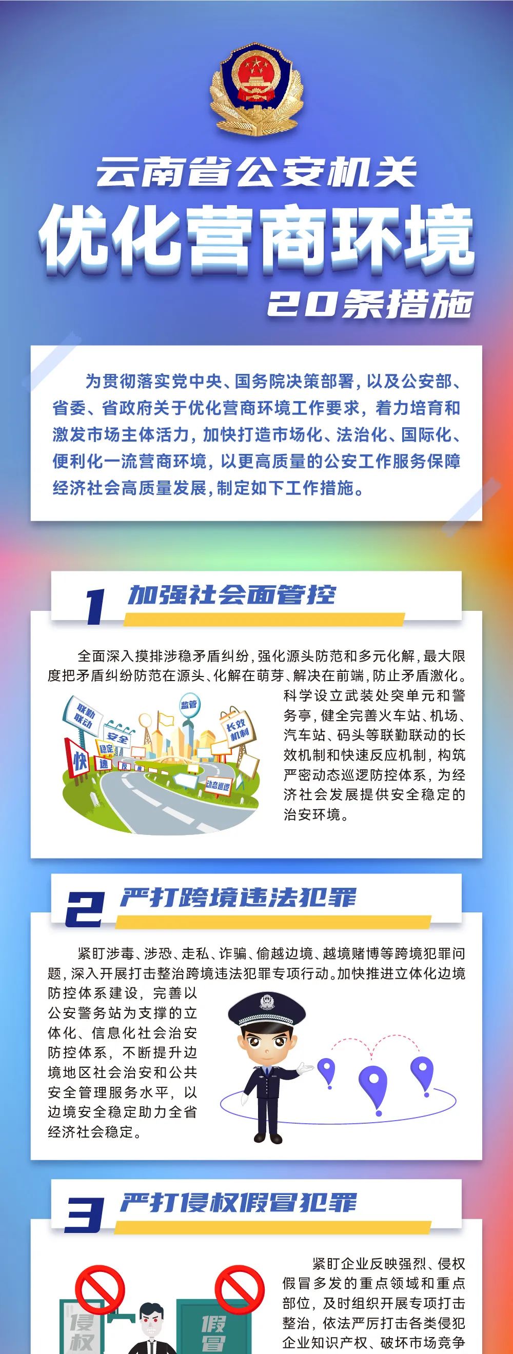 为进一步优化营商环境,护航云南经济社会高质量发展,云南省公安厅再次推出优化营商环境20条措施。其中,聚焦创造安全稳定的社会环境,推出加强社会面管控、严打跨境违法犯罪、严打侵权假冒犯罪、深化电信网络诈骗防范治理、严打涉企违法犯罪、建立健全常态化政企沟通机制6项措施;聚焦营造公平公正的法治环境,推出严格涉企刑事案件规范执法、审慎适用强制措施和侦查措施、建立对企业“无事不扰”机制、建立对企业首次轻微行政违法行为免罚清单4项措施;聚焦打造高效便捷的服务环境,推出推进政务服务“一窗通办”“一网通办”、全面开放人才就业落户政策、推进户籍办理便利化、优化交通服务管理、加强企业印章管理服务、加强企业网络安全监管、全面推行“证照分离”改革全覆盖、强化保安行业服务水平8项措施;聚焦健全完善新型监管机制,推出创新监管方式、强化服务内部监督2项措施。