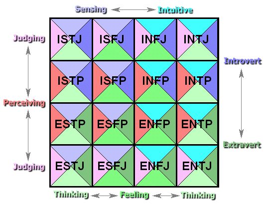 测试尝试分配四个类别:内向( Introversion )或外向( Extroversion )、实感( Sensing )或直觉( Intuition )、思考( Thinking )或情感( Feeling )、判断( Judging )或感知( Perceiving )。取各类别的首字母来组成测试结果之类别名称,如 “INFJ” 或 “ENFP” 。