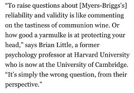 他的回答是: “ 就像去评论圣餐酒的美味或者圆顶小帽在保护头部的作用。 ” ,也就是说 MBTI 的信度和效度只有象征意义。