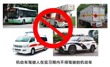 机动车驾驶人在实习期内不得驾驶公共汽车、营运客车或者执行任务的警车、消防车、救护车、工程救险车以及载有爆炸物品、易燃易爆化学物品、剧毒或者放射性等危险物品的机动车;驾驶的机动车不得牵引挂车。