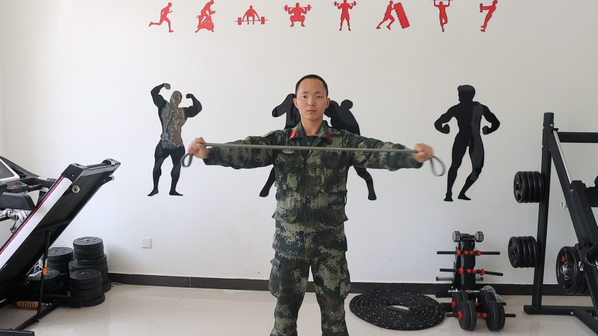 向两侧拉弹力带的动作全过程,需保持手臂伸直、延展,建议重复10—15次。