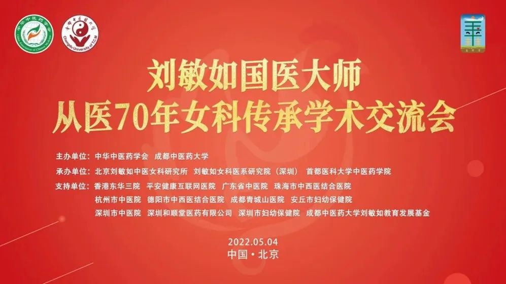 为传承刘敏如国医大师学术思想和临床经验,推动中医女科学术发展,由中华中医药学会、成都中医药大学主办,北京刘敏如中医女科研究所、深圳刘敏如女科医系研究院、首都医科大学中医药学院承办的“刘敏如国医大师从医70年女科传承学术交流会”于2022年5月4日在京召开。原卫生部副部长、中国医师协会原会长殷大奎,原国家卫生健康委副主任、国家中医药管理局原局长王国强,原国家中医药管理局副局长李大宁,中华中医药学会副会长兼秘书长王国辰,北京市中医管理局局长屠志涛,成都中医药大学党委书记刘毅,成都中医药大学校长余曙光,原成都中医药大学副校长万德光,四川省中医药管理局副局长李道丕,广东省中医药学会会长吕玉波等出席本次线上交流会。交流会由中华中医药学会副秘书长孙永章主持。