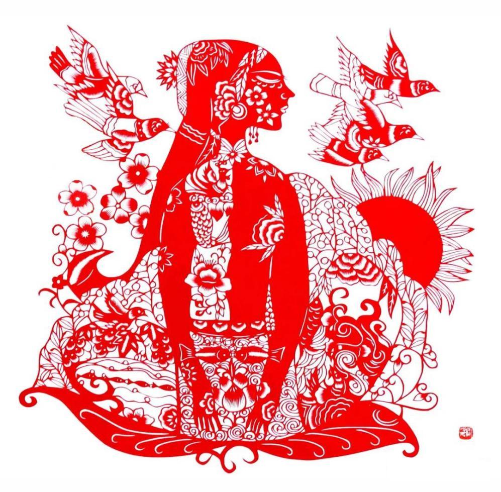 孔春霞剪纸作品《羲和》,纪念中国首颗太阳探测科学技术试验卫星“羲和号”。“羲和号”名称取意“效法羲和驭天马,志在长空牧群星”,象征中国对太阳探索的缘起与拓展。该作品阴刻与阳剪合璧,将太阳、女神、花鸟、虫鱼等元素,通过剪纸语言有机融合在一起,集中国传统文化与民族技艺于一体。柘荣县委宣传部 供图
