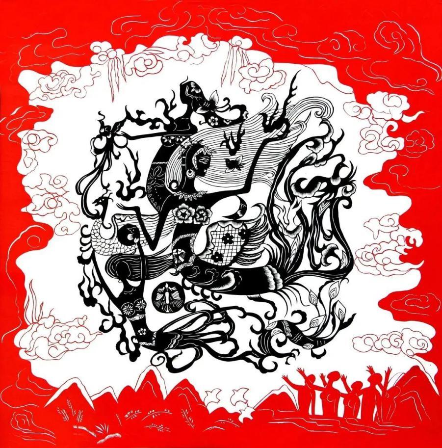 柘荣剪纸省级代表性传承人、福建省工艺美术大师孔春霞剪纸作品《女娲补天》大胆应用红与黑两种对比强烈的色彩,块面与线条竞相呼应,再现了神话故事女娲补天的壮观场景。古代传说中的青鸟、神兽、凤凰等形象,让画面更加具有部落图腾时代的神秘感,彰显剪纸艺术的独特魅力。柘荣县委宣传部 供图