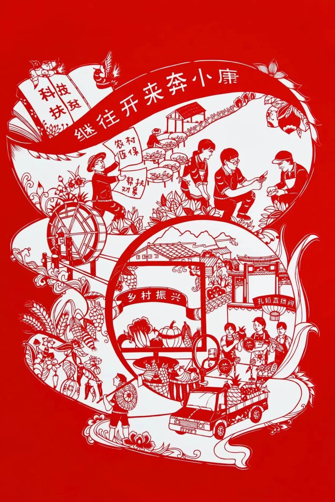 柘荣剪纸艺术也深刻反应时代主题和人民的生活状态,这袁秀莹的弟子孔春霞创作的反映脱贫攻坚主题的剪纸作品。柘荣县委宣传部 供图