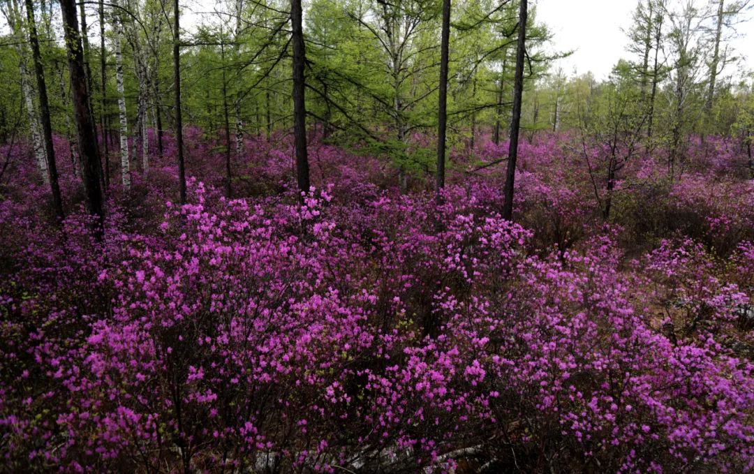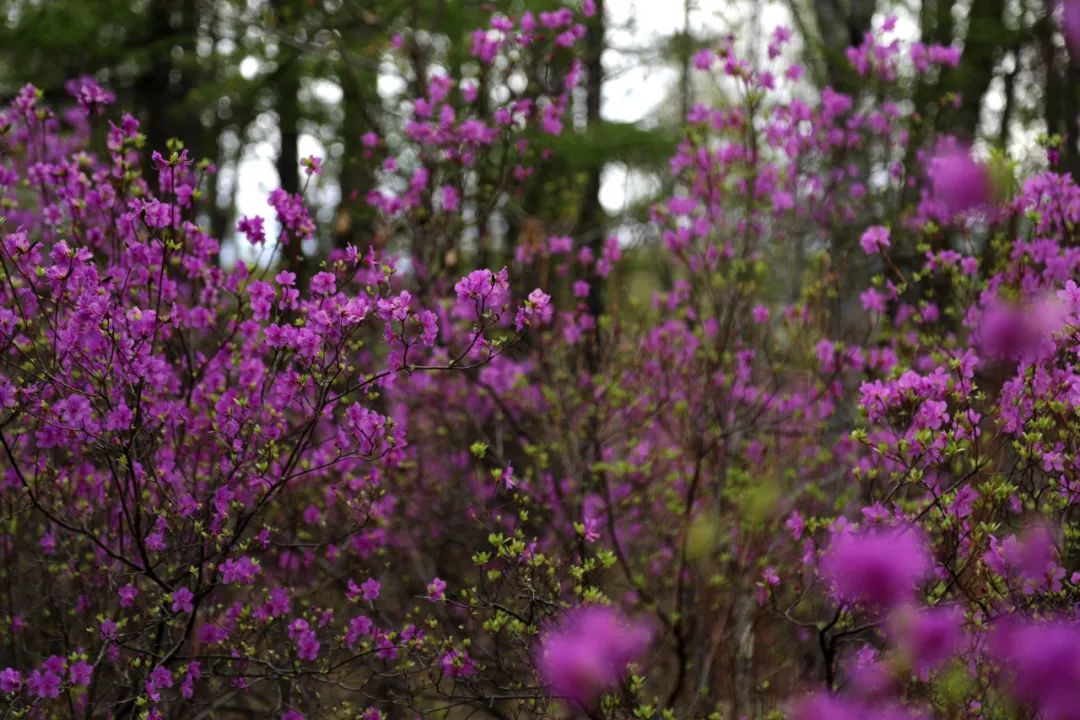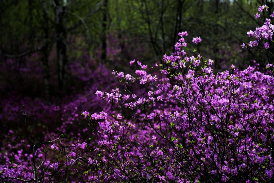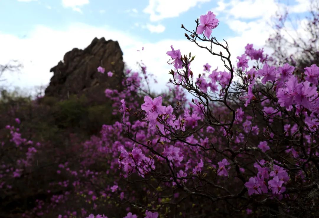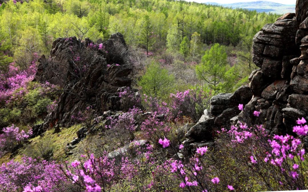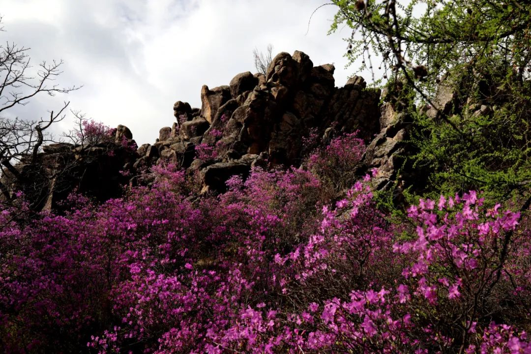 初夏是松岭林业局古源林场飞龙山地质公园最美的时节。放眼望去,盛开的野生杜鹃花在群山叠翠上连绵数公里,姹紫嫣红、分外妖娆,经历地质变迁形成的石林,沿山岭高低错落,独具特色,在绿色海洋中杜鹃花簇拥着奇峰异石,崖壁之上古人留下300多幅彩绘岩画,风霜雪雨数千年依旧清晰可辨,让人叹为观止,神秘史前岩画以及神奇的地质景观与花海交相辉映,这些美轮美奂的山水风光绘就了飞龙山的秀美画卷。