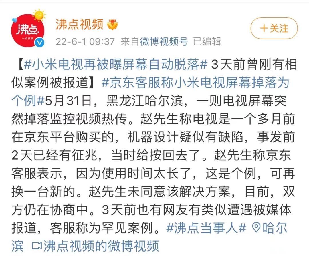5月31日,黑龙江哈尔滨市的赵先生(化名)爆料称,其公司使用的小米电视出现了液晶屏幕脱落的情况,并且发布了屏幕脱落过程的监控视频。