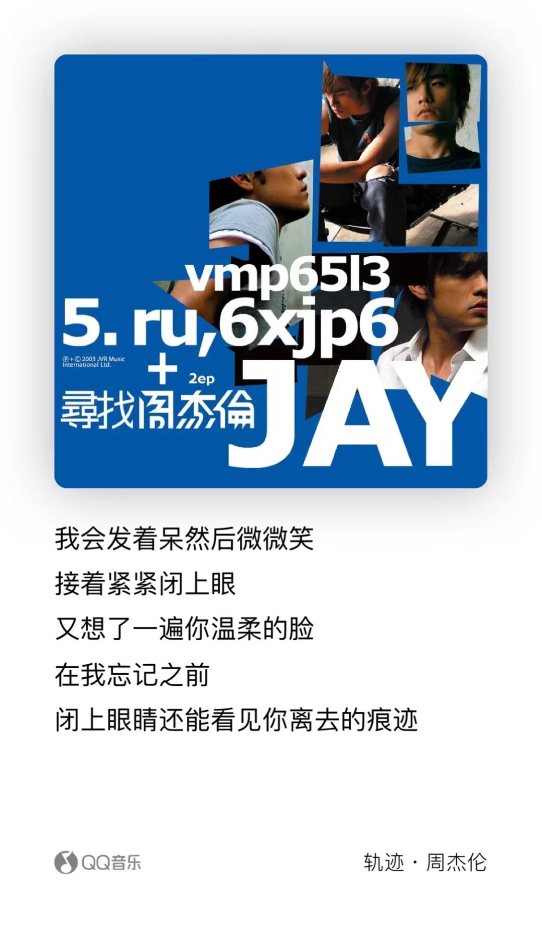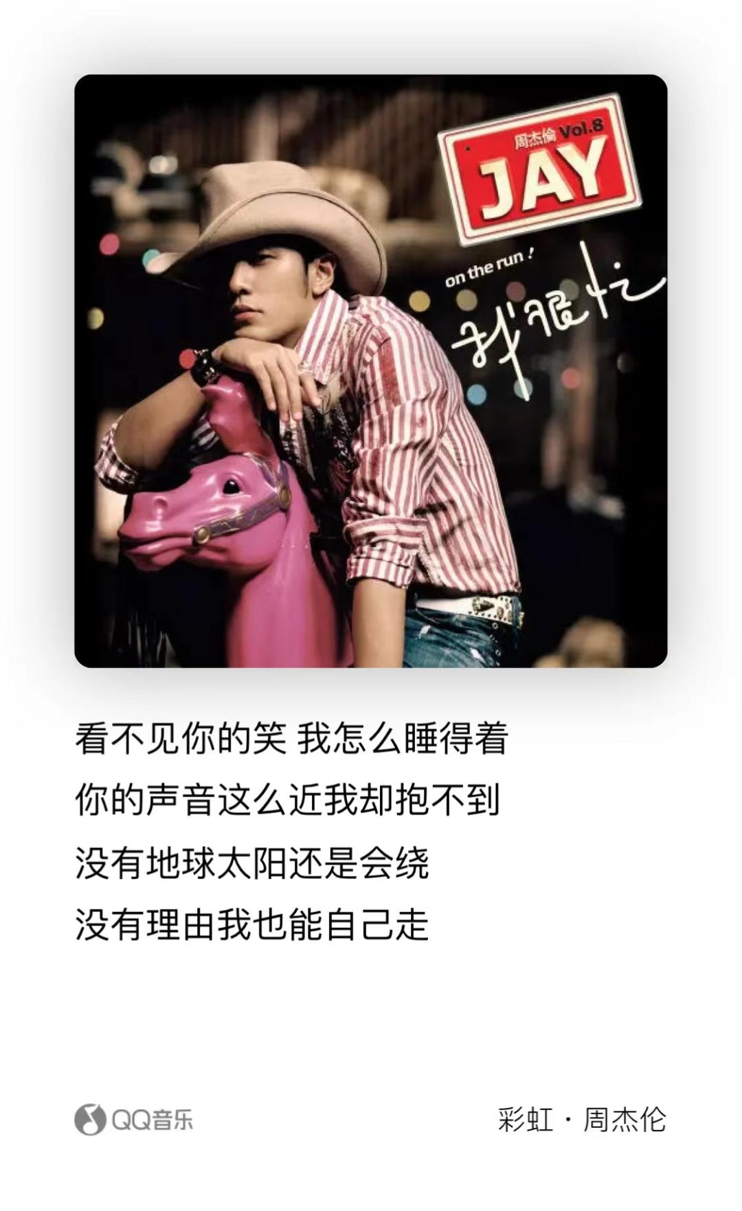 @七彩:还记得小学的音乐老师也是杰伦的粉丝,她第一次上课教我们的歌就是杰伦的《彩虹》,身边的同桌会跟着歌词一句一句地抄下来,“看不见你的笑我怎么睡得着”好像写满了每个少年的懵懂心事。《轨迹》里藏着我的失恋心事